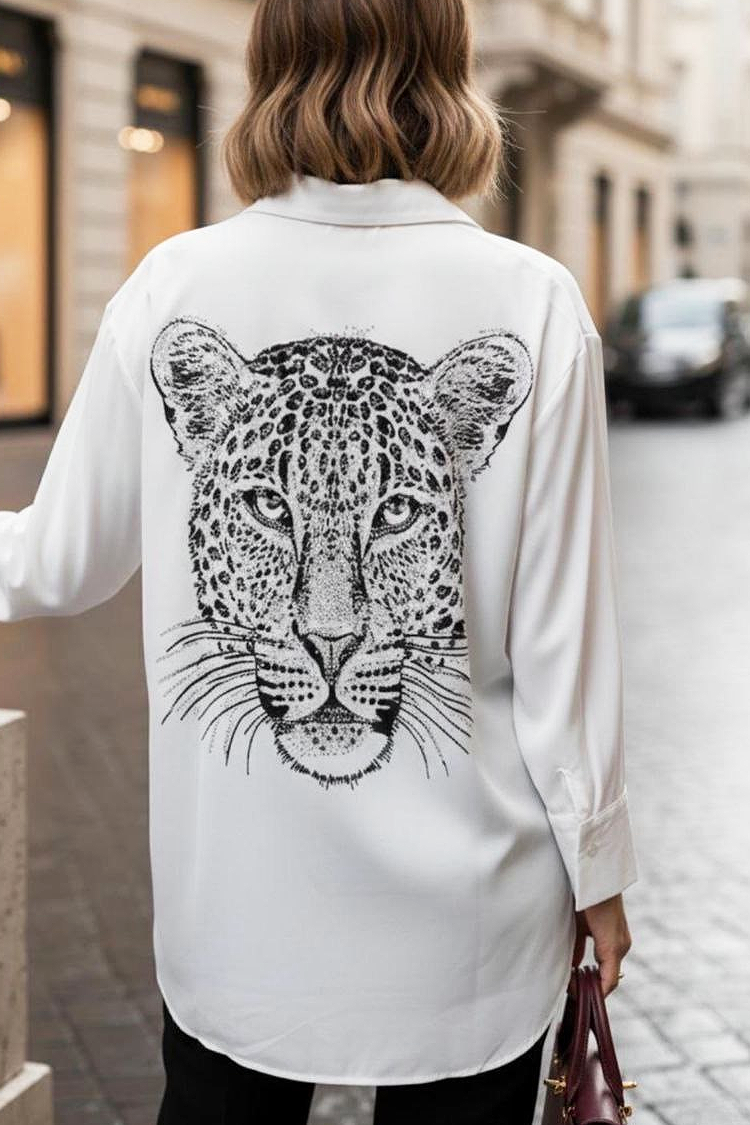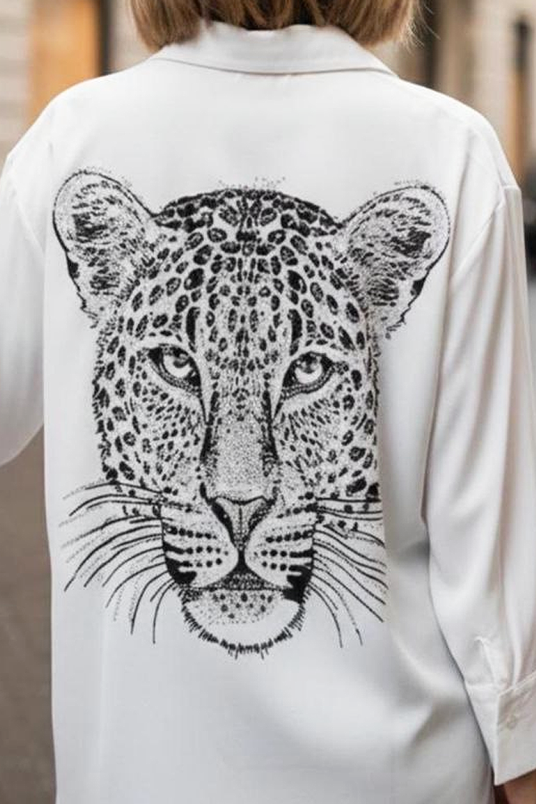 - Model zapinany jest na całej długości na guziki, ma kołnierzyk, klasyczny krój i nadruk po obu stronach.