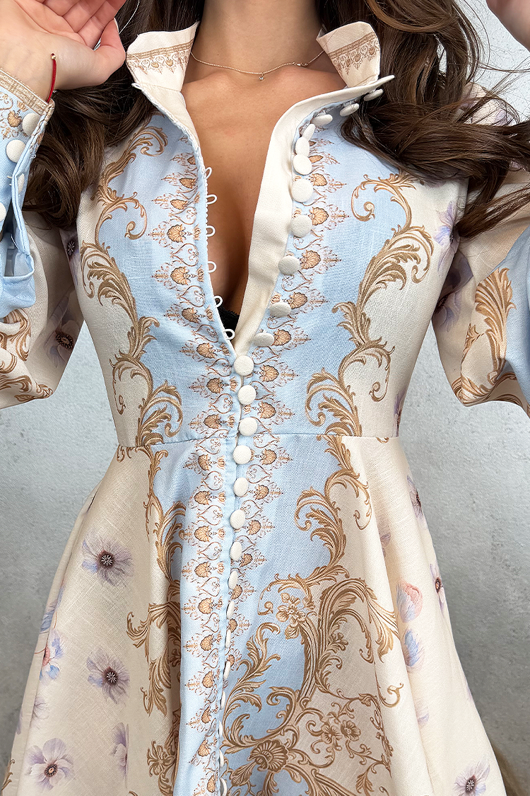 - Sukienka ma krótkie rękawy, guziki na całej długości, kołnierzyk i wielokolorowy wzór.