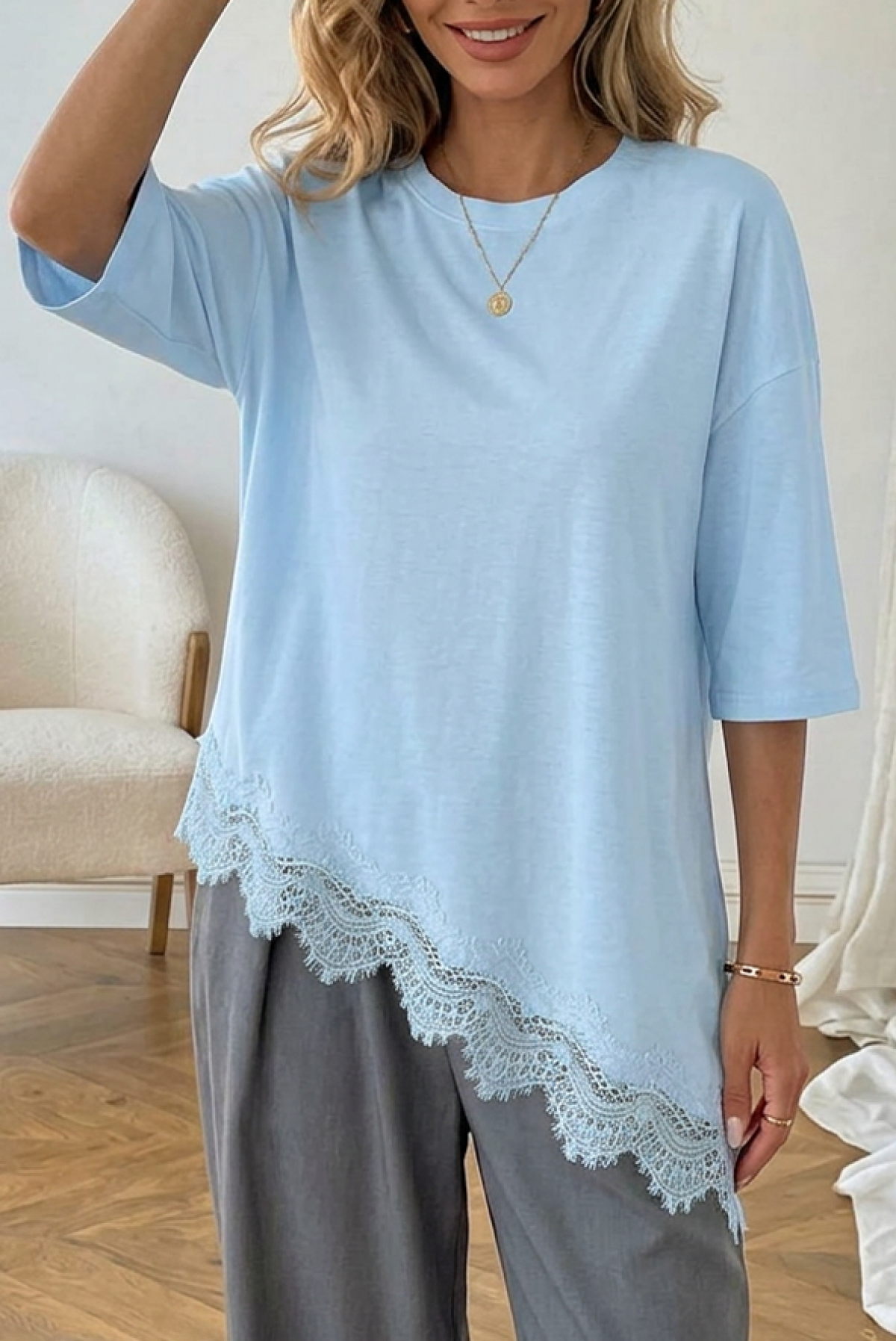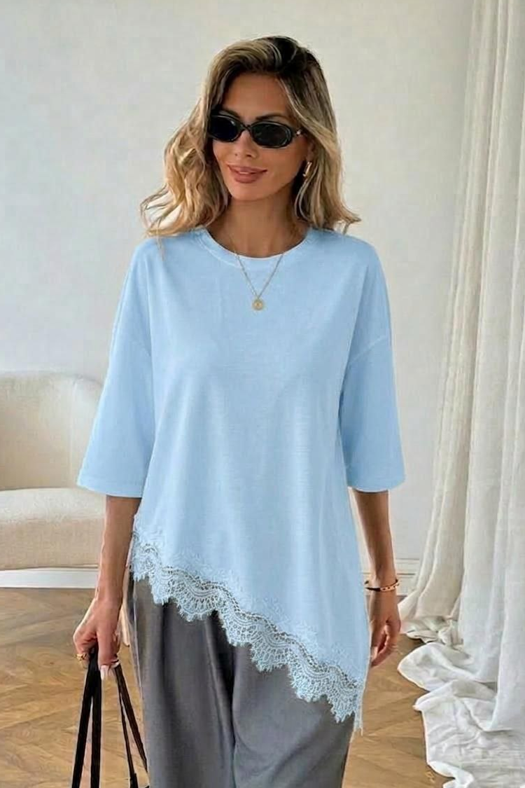 - Model ma luźny, asymetryczny krój i efektowne ażurowe wykończenie z koronki.
