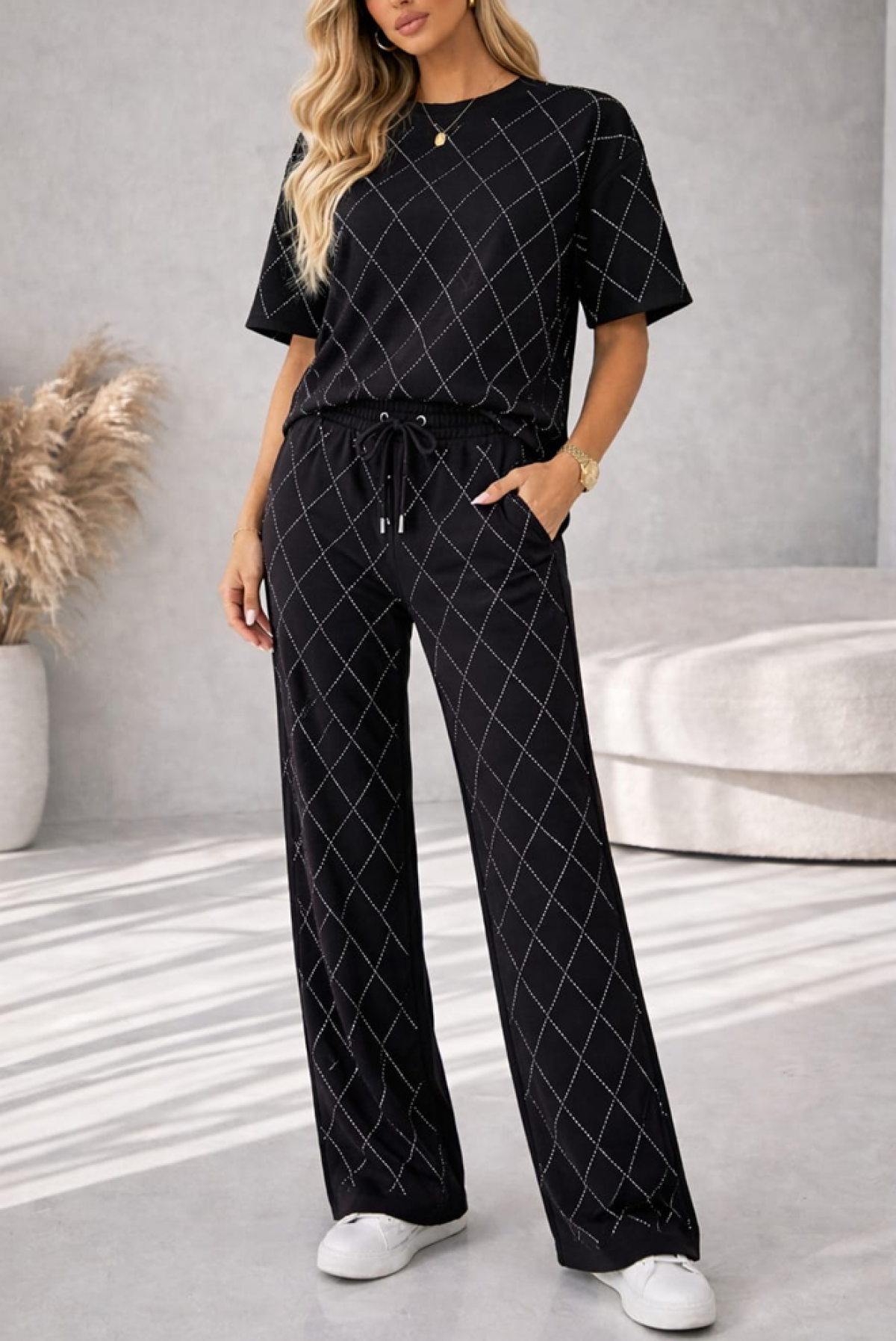 - Spodnie mają wysoki stan, luźny krój i praktyczne wiązania.