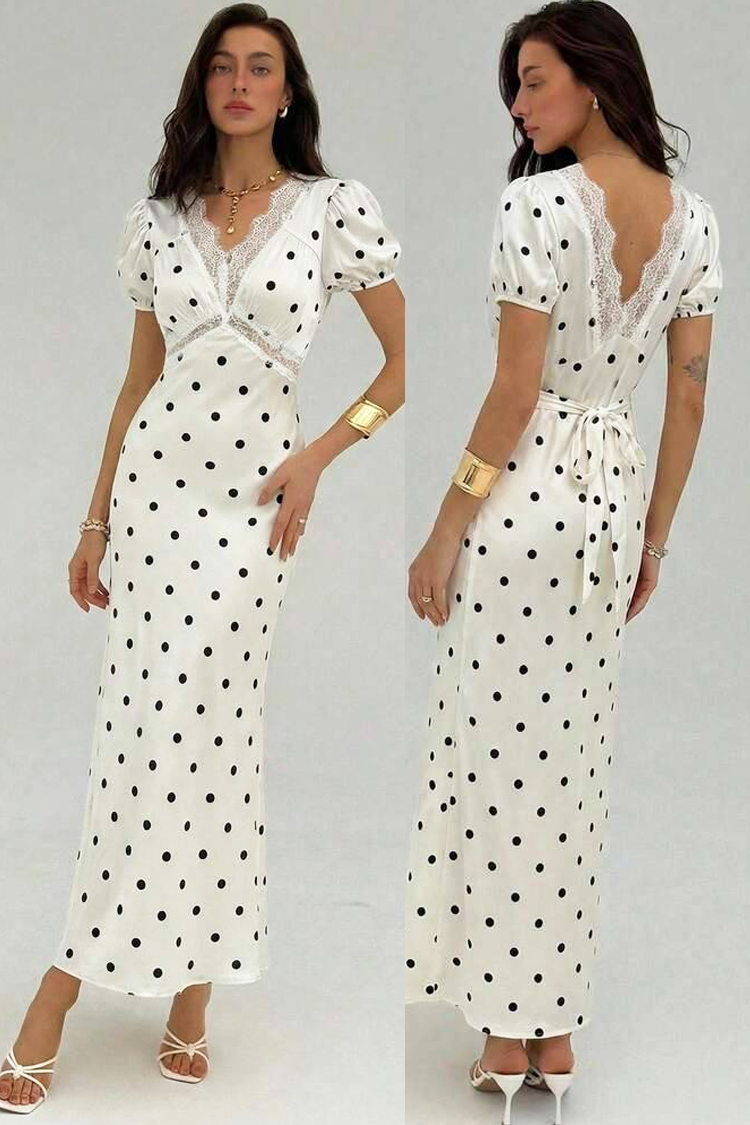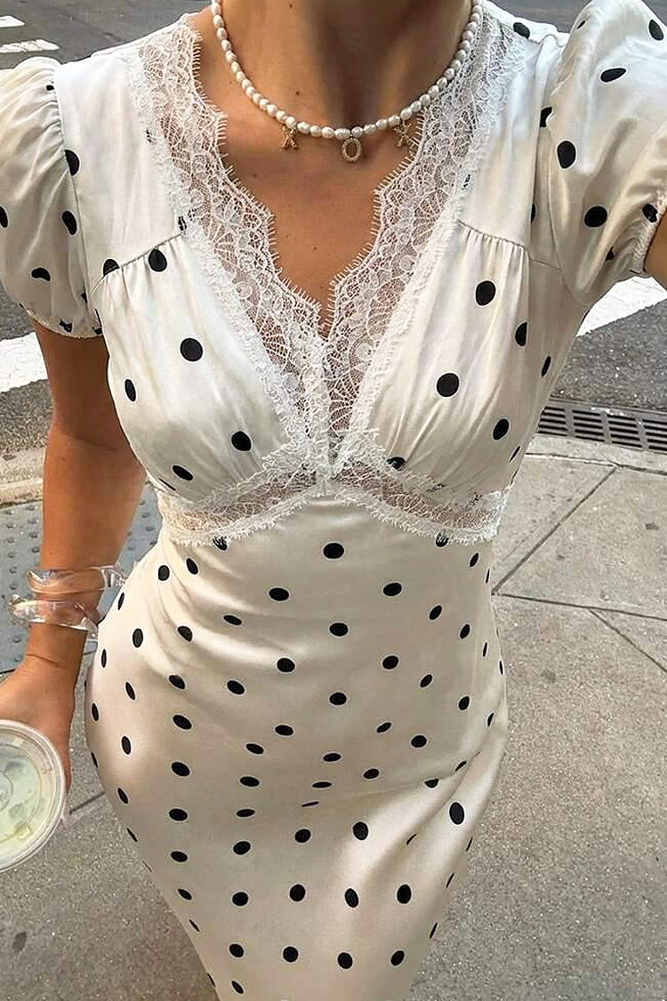 - Model ma szykowny fason, prosty krój, wzór w groszki, biały kolor, seksowny dekolt i koronkę.