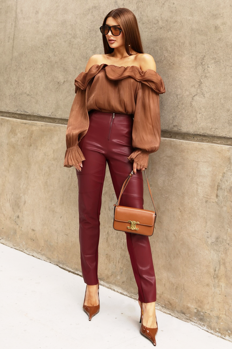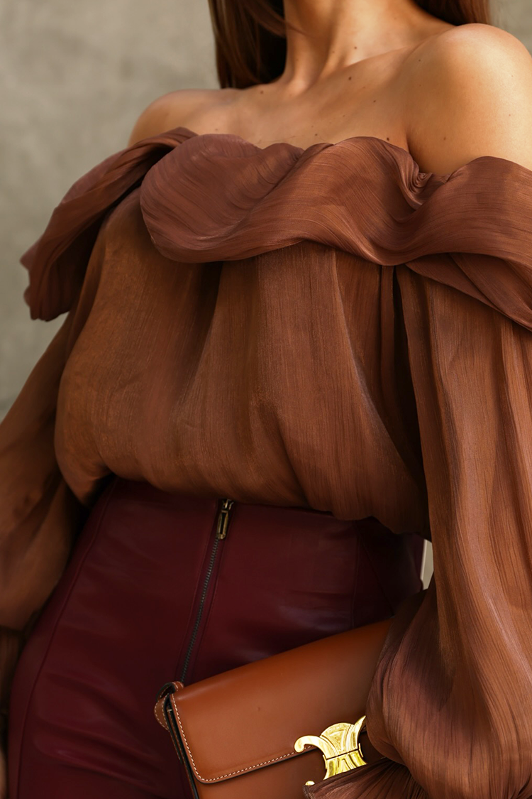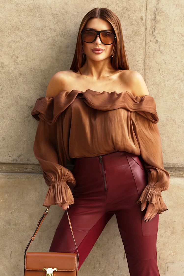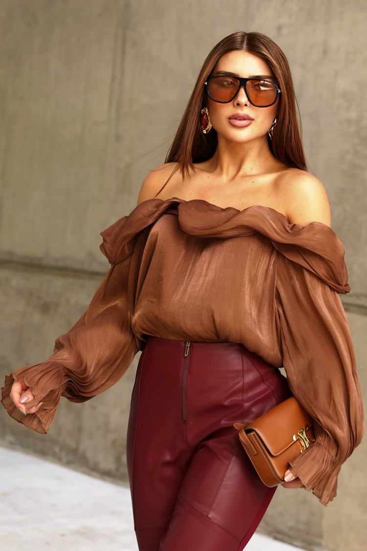 - Model ma długie rękawy, zalotny wzór, odkryte ramiona i jasnobrązowy kolor.