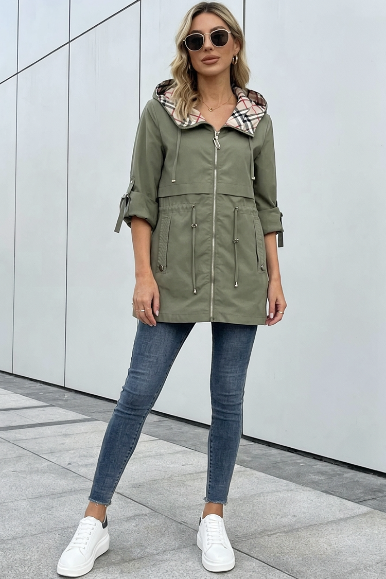 - Model posiada kaptur, zamek błyskawiczny na całej długości z przodu, kieszenie boczne i wiązanie w talii.
