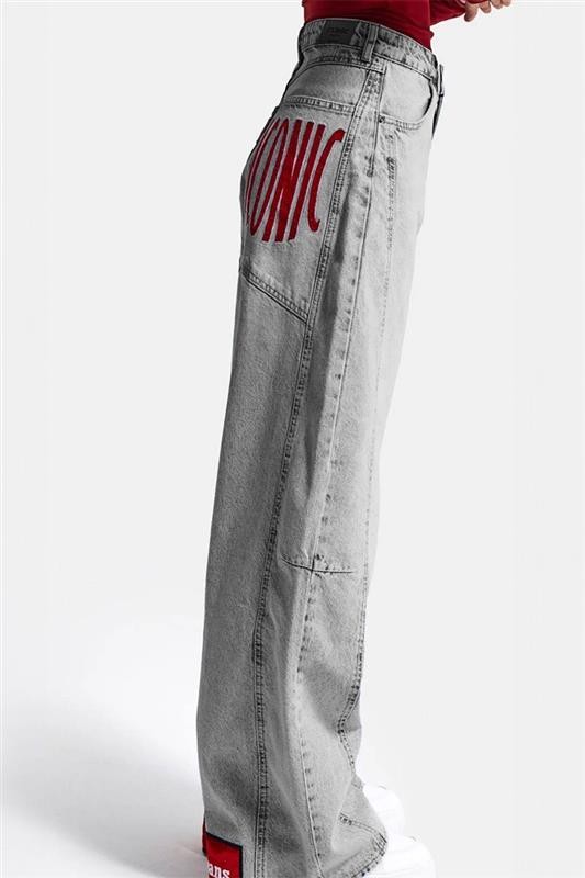 - Model ma wysoki stan, luźny krój, jasnoszary wzór i czerwony haft.