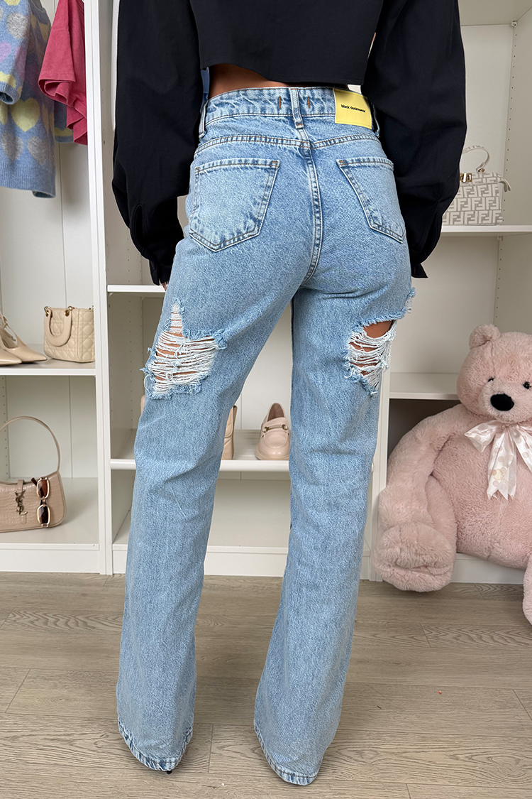 - Model ma wysoki stan, prosty krój, seksowne przetarcia z tyłu i niebieski wzór.