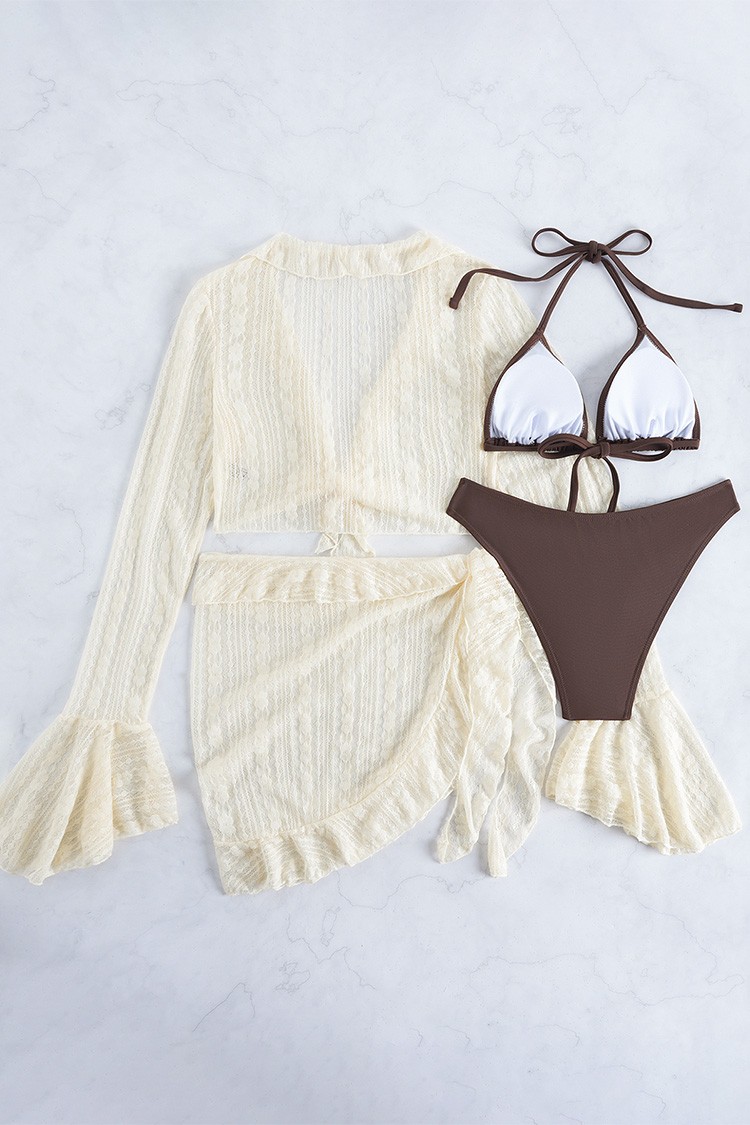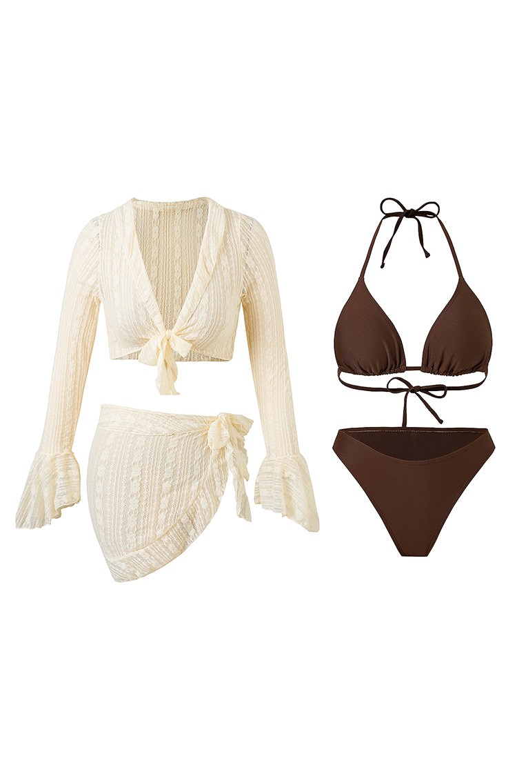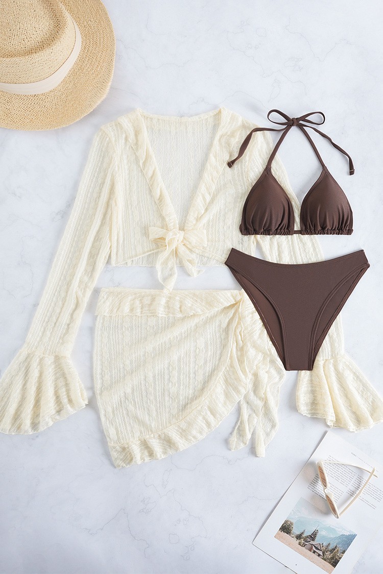 - Nowoczesny komplet plażowy składający się z dwuczęściowego kostiumu kąpielowego, rękawów i pareo.