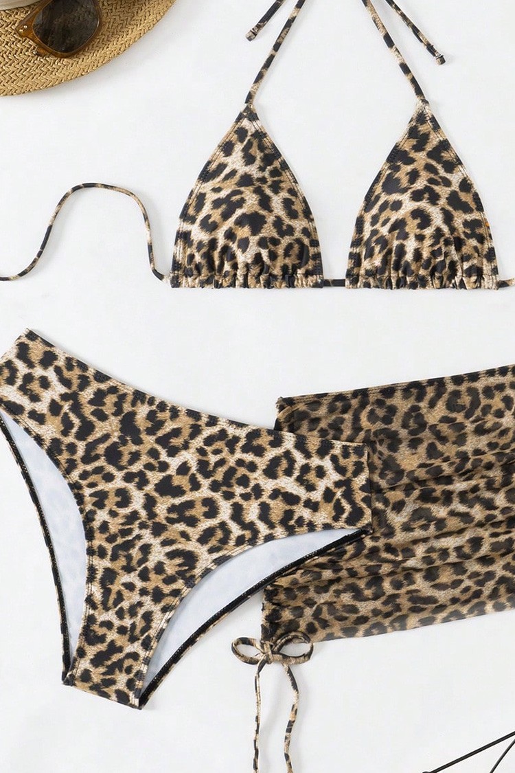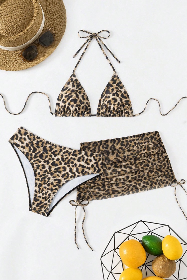 - Nowoczesny komplet plażowy składający się z dwuczęściowego kostiumu kąpielowego i spódnicy.