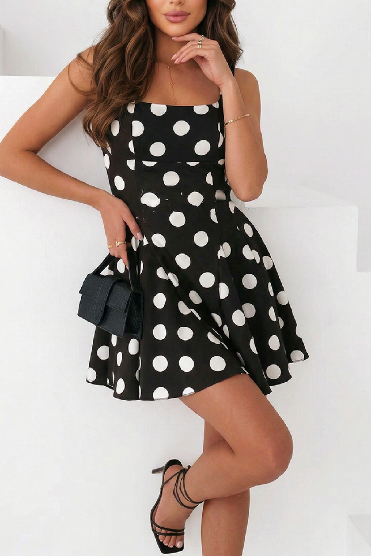 - Model ma długość mini, zalotny krój, seksowny dekolt i wzór w groszki.