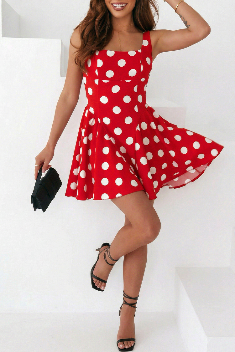 - Model ma długość mini, zalotny krój, seksowny dekolt i wzór w groszki.