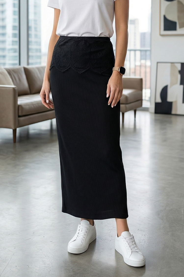 - Model ma długość mini, dopasowany krój, koronkowe akcenty i jest w czarnym kolorze.