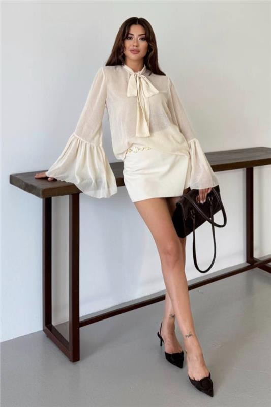 - Model ma długie, efektowne rękawy, luźny krój i elegancki design.