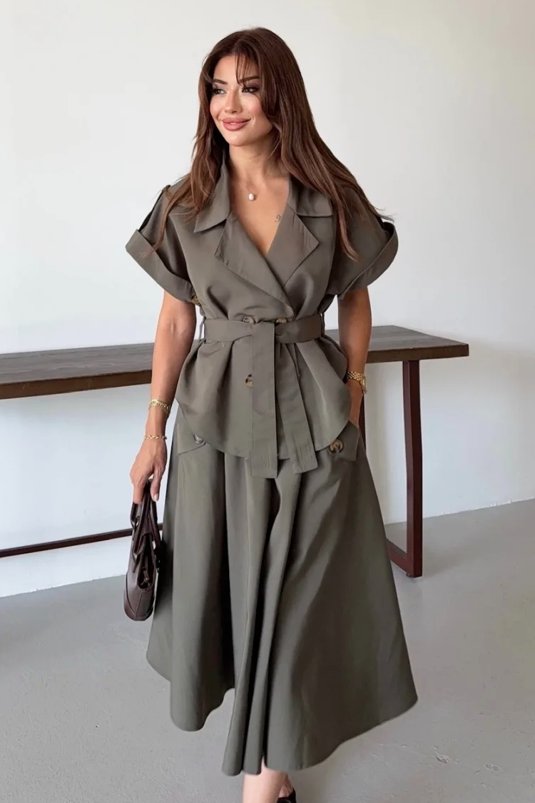 - Góra posiada stylowy krój, zapięcie na guziki na całej długości oraz pasek podkreślający talię.
