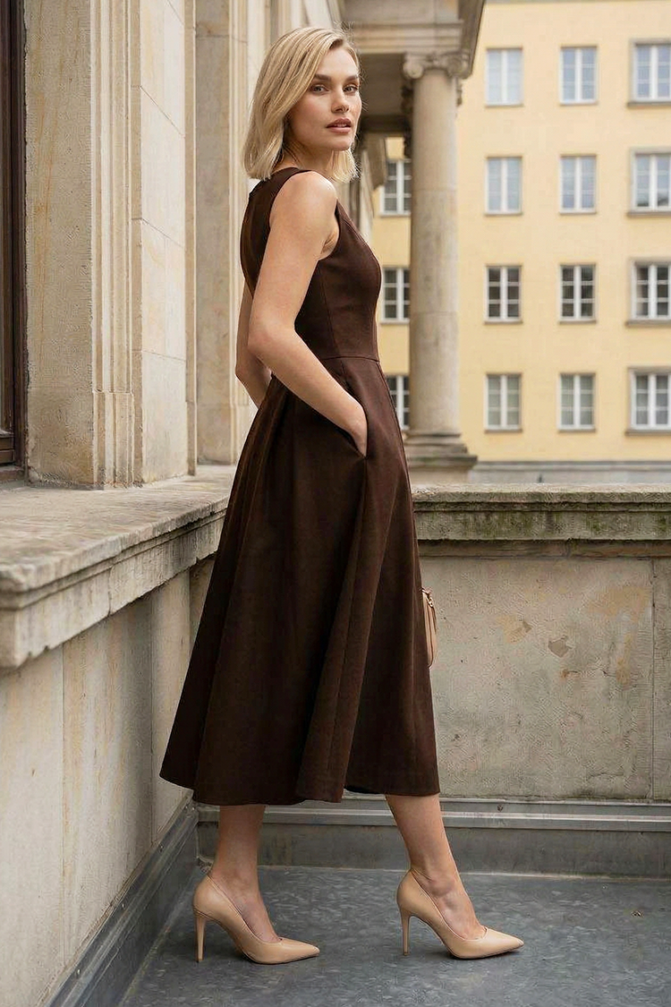 - Wybierz tę elegancką sukienkę midi w kolorze brązowym, idealną na specjalne okazje oraz do modnych stylizacji.