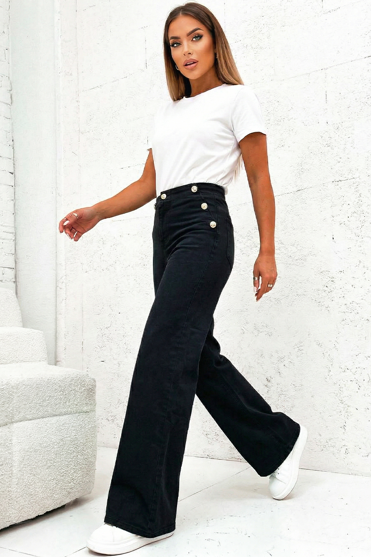 - Model ma wysoki stan, szerokie nogawki i efektowne guziki po bokach, dodając stylu każdej stylizacji.