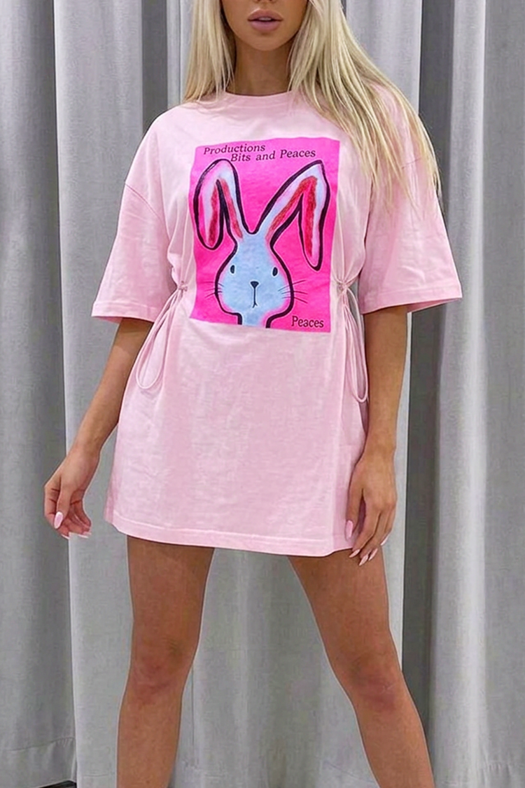 - Model ma krój oversize, krótkie rękawy, nowoczesny nadruk w króliczki oraz klasyczny okrągły dekolt.