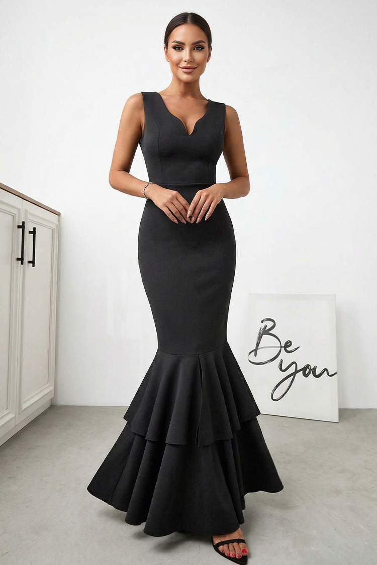 - Model ma krój syreny, eleganckie falbany, dopasowany fason oraz dekolt w kształcie litery V, podkreślając kobiecą sylwetkę.