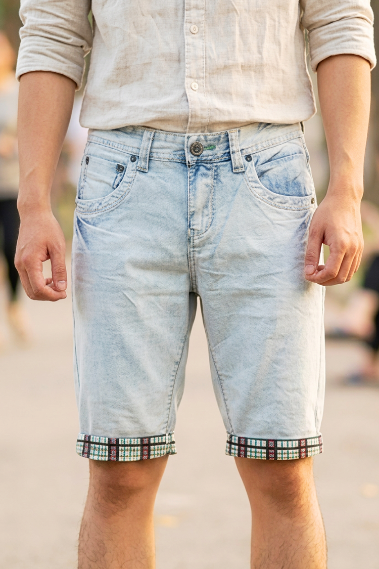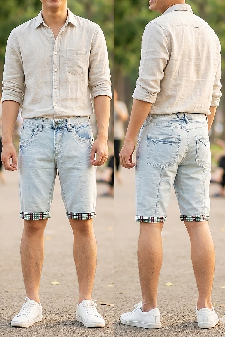 - Elegancki model męskich szortów jeansowych w kolorze jasnoniebieskim, pasujący do różnych stylizacji męskich.