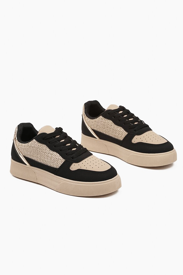- Model wykonany jest z materiału tekstylnego i posiada platformę o wysokości 3,5 cm, a także tekstylną podszewkę dla większego komfortu.