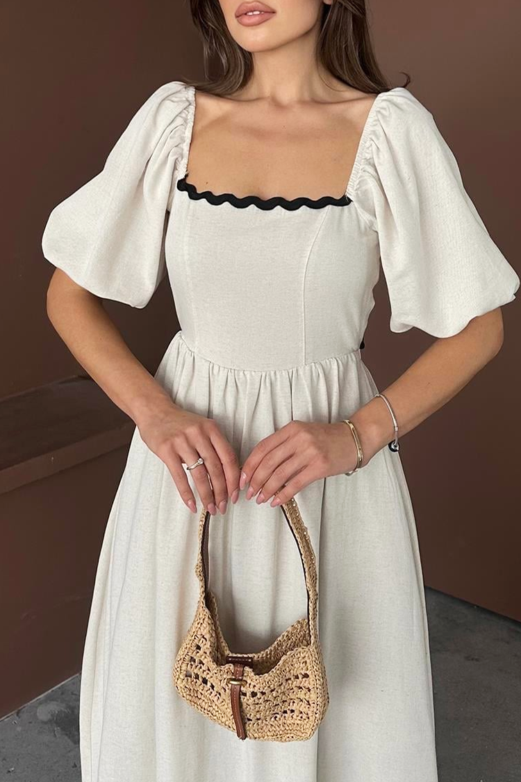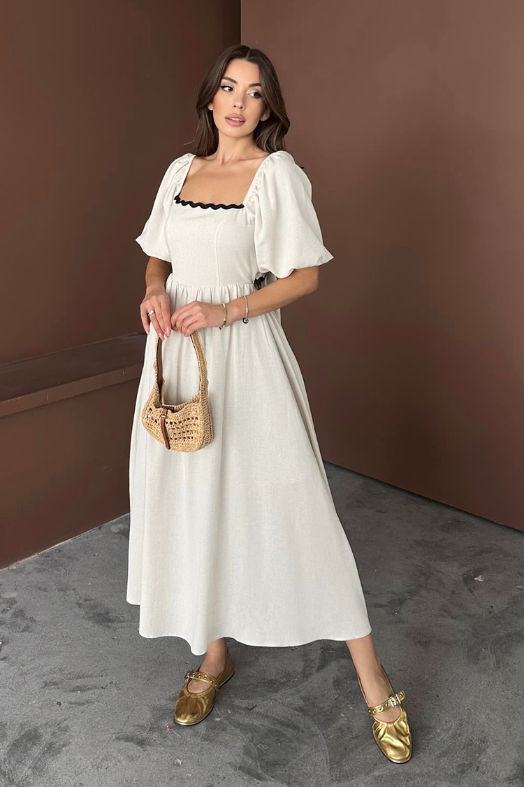 - Sukienka ma długość midi, modny krój, kwadratowy dekolt, krótkie bufiaste rękawy, czarne detale oraz wiązanie z tyłu.
