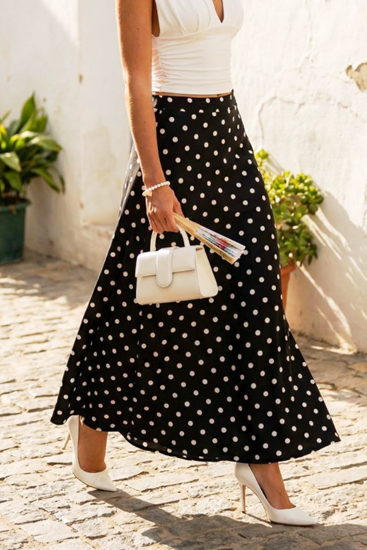 - Model ma rozkloszowany krój, średnio wysoki stan, wzór w groszki i jest w kolorze czarnym.