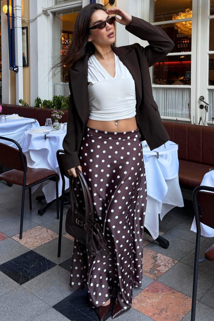 - Model ma rozkloszowany krój, średnio wysoki stan, wzór w groszki i jest w kolorze brązowym.