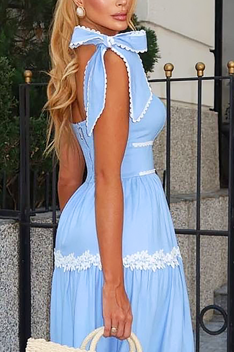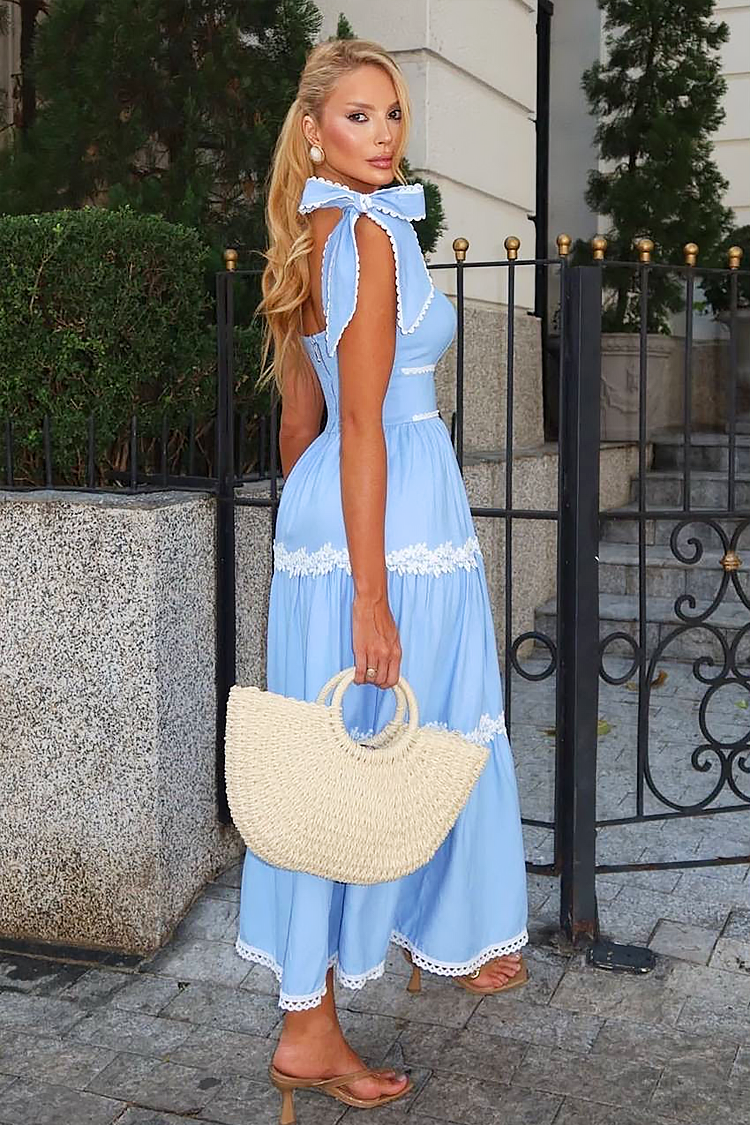 Ta zwiewna sukienka w błękitnym kolorze to idealny wybór na ciepłe dni. Daje poczucie świeżości i stylu – sprawdzi się zarówno na co dzień, jak i podczas wyjątkowych letnich okazji.
