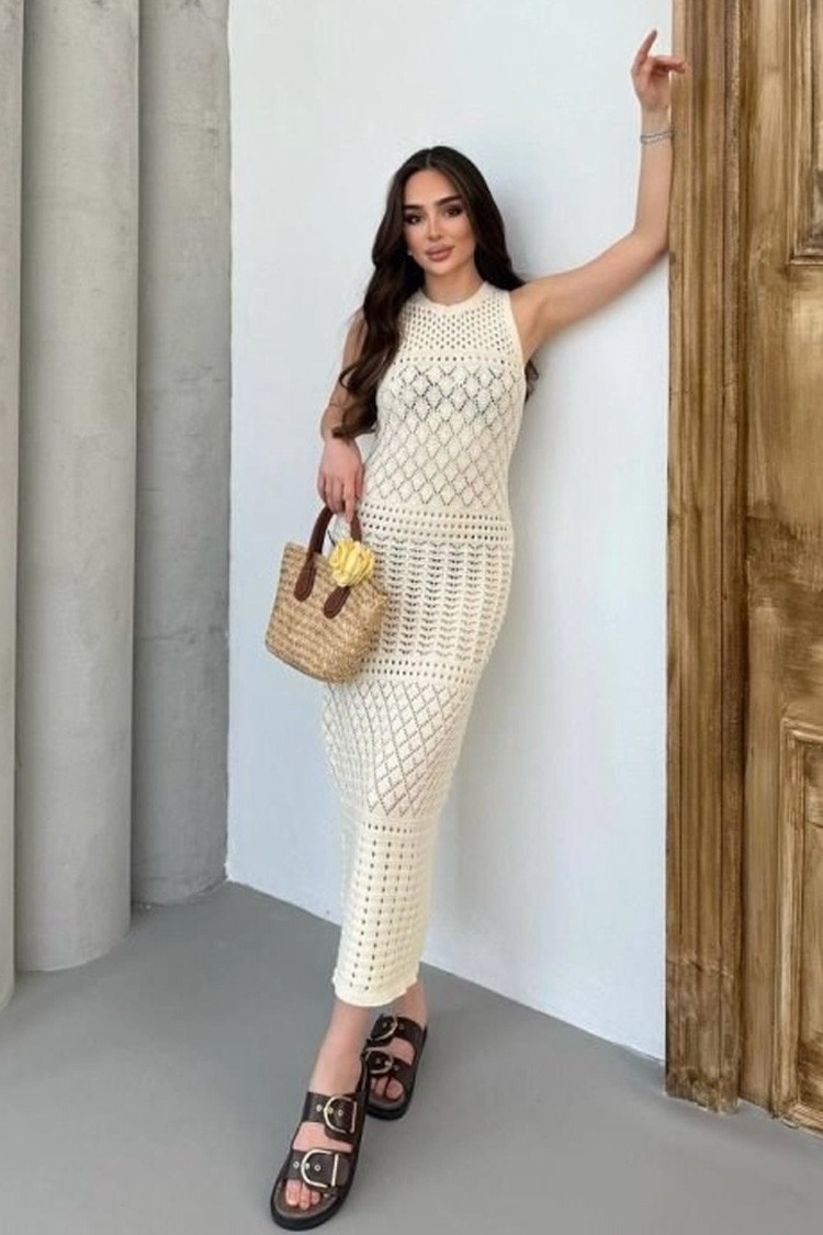 Wykonana z delikatnej, ażurowej dzianiny, sukienka subtelnie podkreśla linię sylwetki, jednocześnie pozwalając skórze oddychać. Design z odkrytymi ramionami tworzy efektowny look, który sprawdzi się zarówno na plaży, jak i w beach barze czy przy basenie.