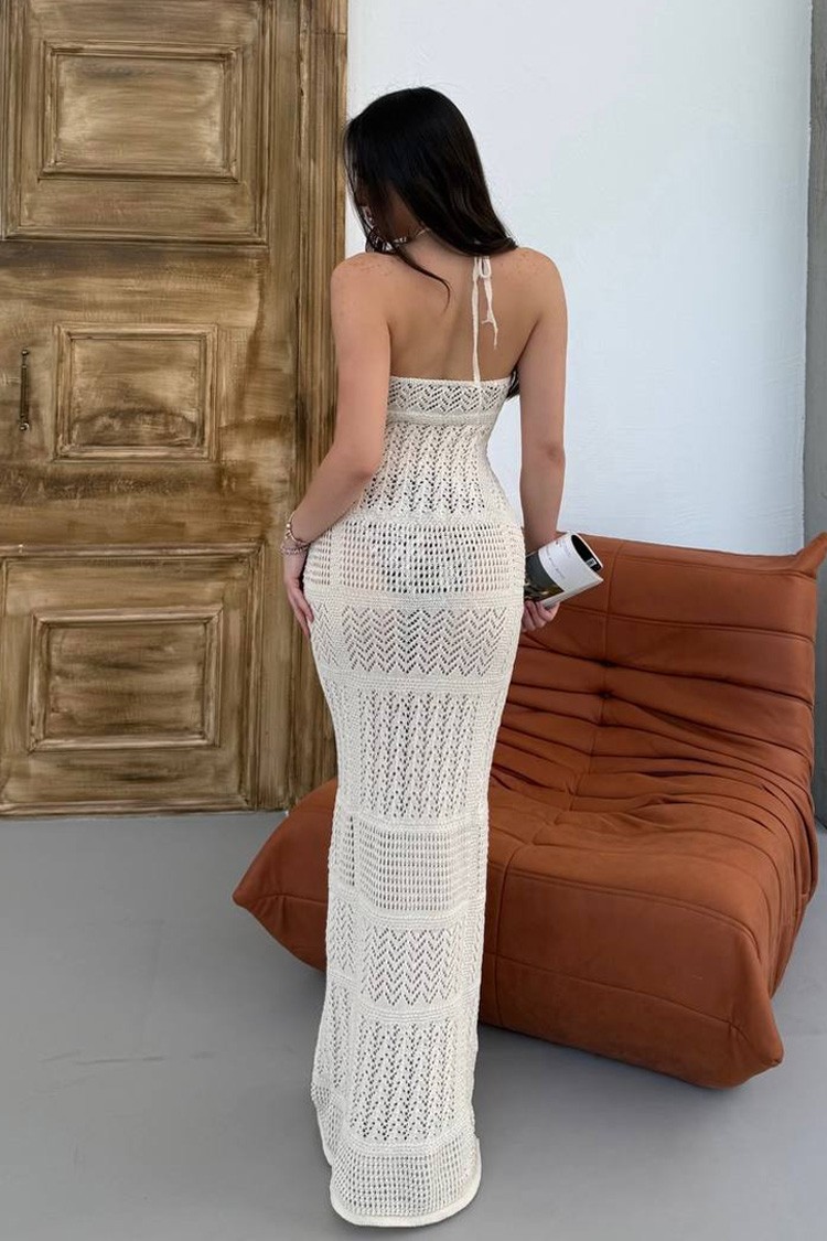 Długa dzianinowa sukienka plażowa z odkrytymi plecami KLEOPATRA ECRU