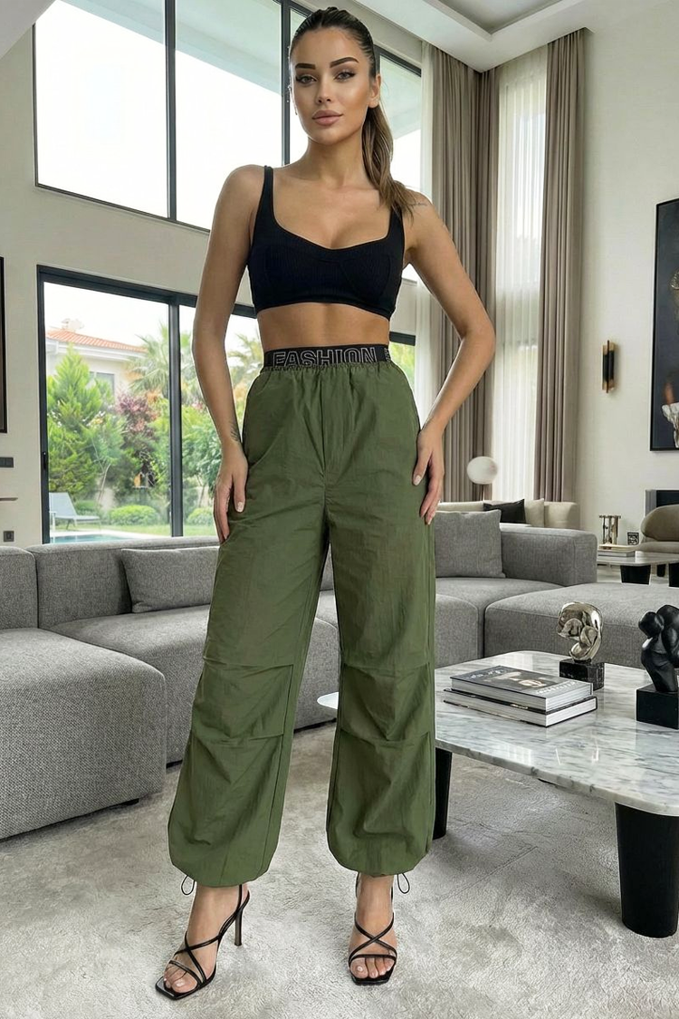 Łączą wysoki stan oraz szeroki, elastyczny pas z napisem „FASHION”, który podkreśla talię i nadaje całości nowoczesny, wyrazisty akcent.