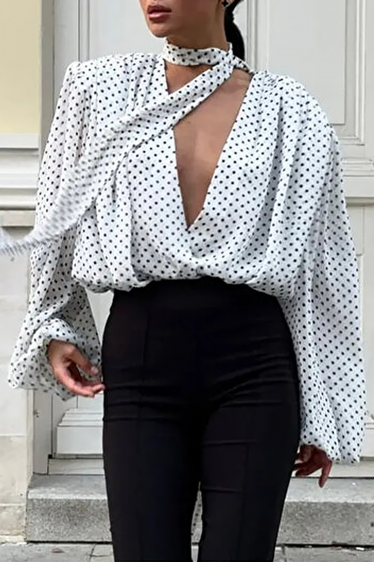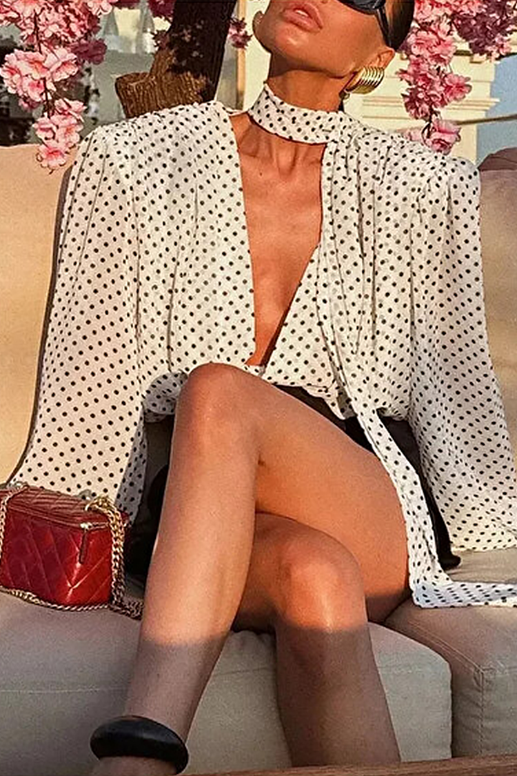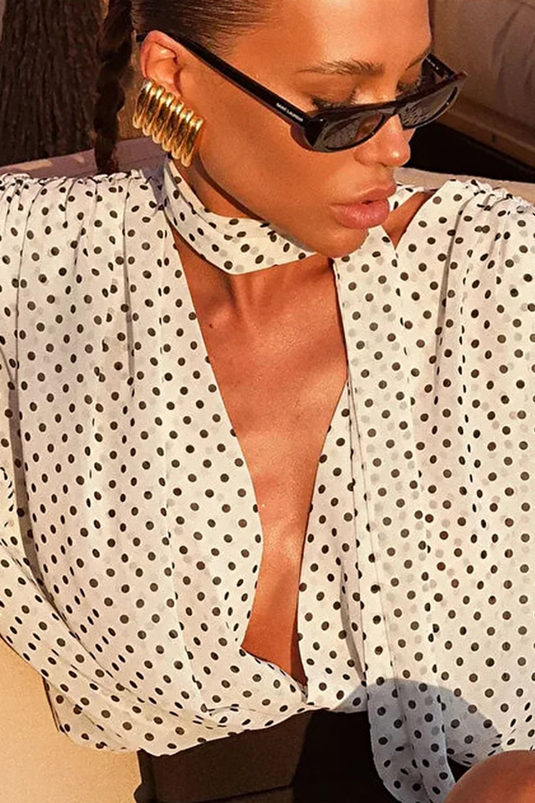 Koszula damska w białe groszki z dekoltem w serek i efektownym krawatem VIALINA