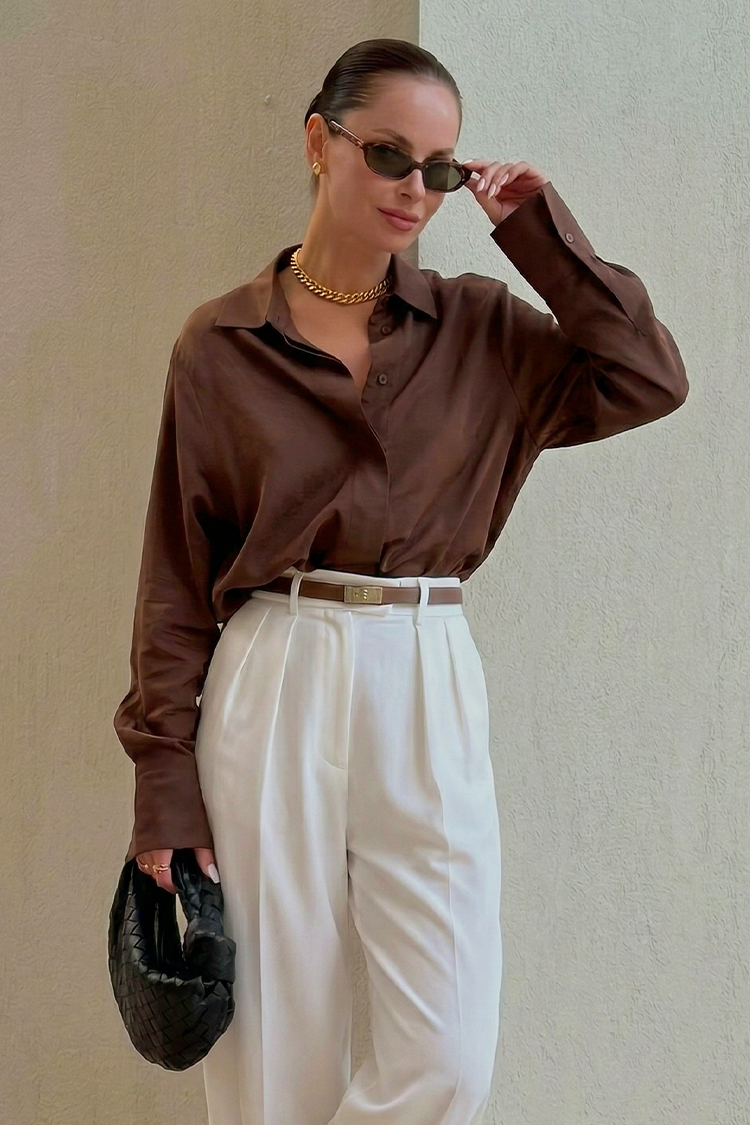 Elegancka satynowa koszula damska z długim rękawem AYANDA BROWN