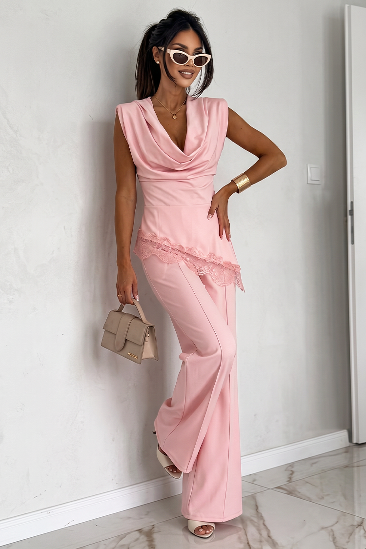 Swobodny komplet top z efektownym dekoltem i szerokimi spodniami ZELVORA PINK